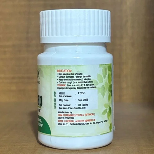 Herbal formulation for skin allergies, urticaria, dermatitis, and respiratory allergies. Supports immunity and skin health.